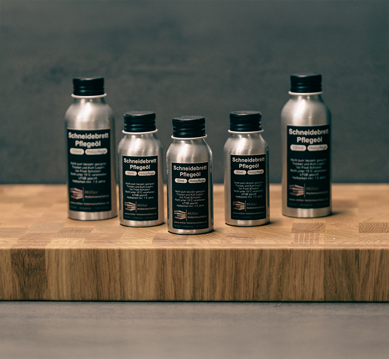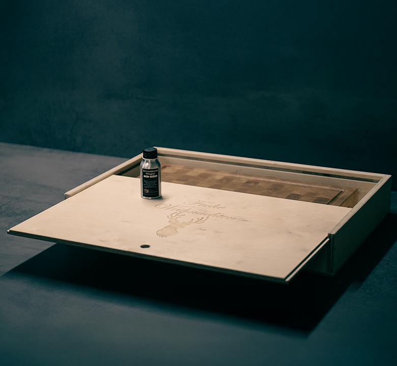 Zu jedem unserer hochwertigen Stirnholz-Schneidebretter erhältst du automatisch eine 50-ml Flasche unseres spezialisierten Pflegeöls dazu. Damit kannst du dein Brett von Anfang an optimal schützen, die natürliche Maserung hervorheben und eine langlebige High-End Oberfläche bewahren.